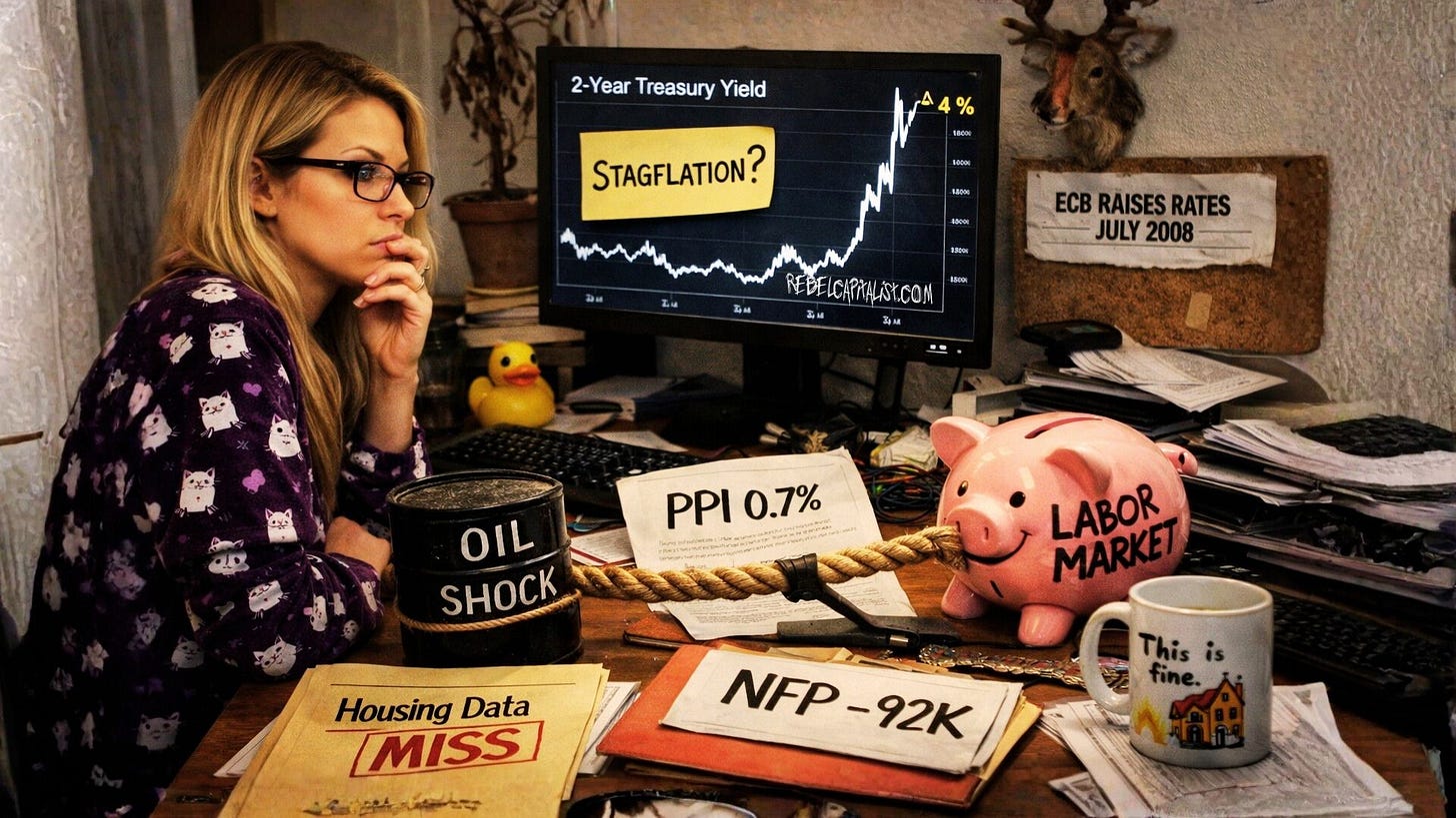 That is not noise. That is the bond market telling you something...and right now, it’s telling you that the Fed’s rate-cutting cycle might be over before it properly started. When the two-year yield traded as high as 3.97% intraday on Thursday against a Fed funds range of 3.5% to 3.75%...you had a market that, for a brief moment, was pricing in the possibility of a Fed rate hike. Not a pause. An actual hike.