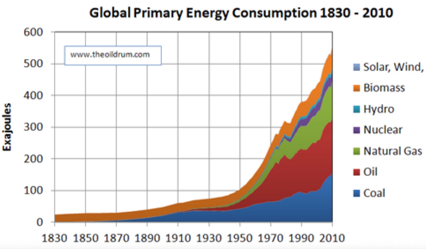 From 1830 to today, global energy consumption has followed an unmistakable exponential curve.