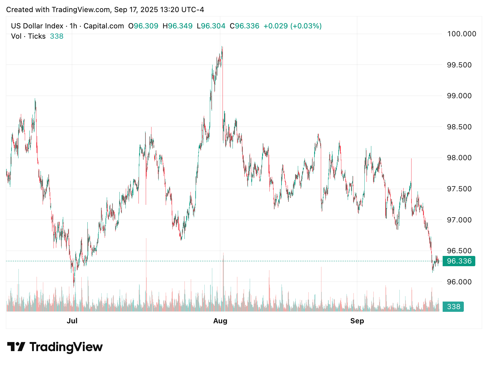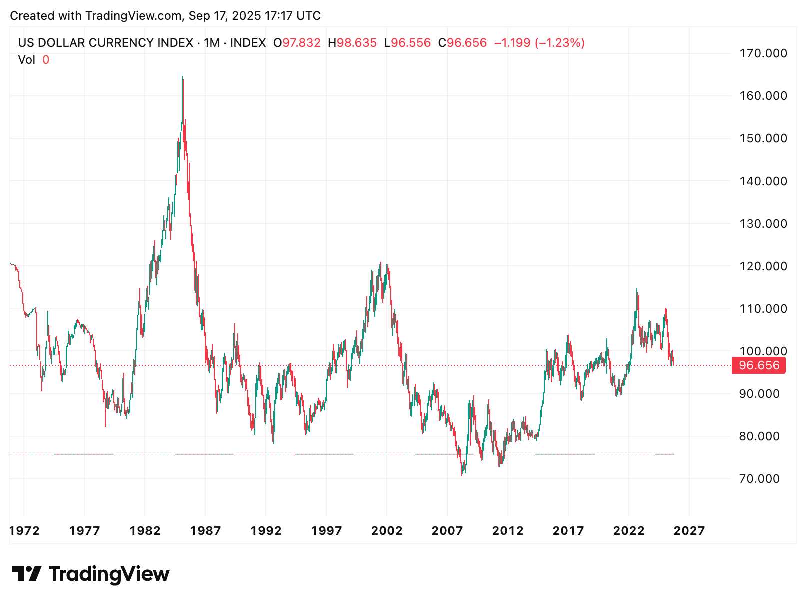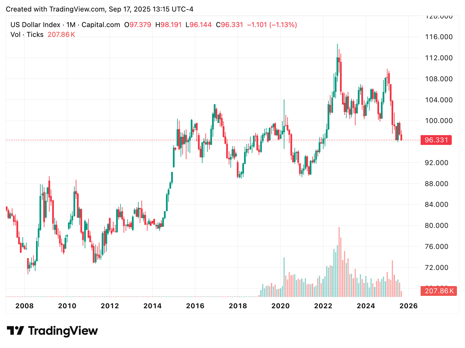 Fast forward to 2025. The dollar has dropped from 100 to 96.66 in about six weeks.
