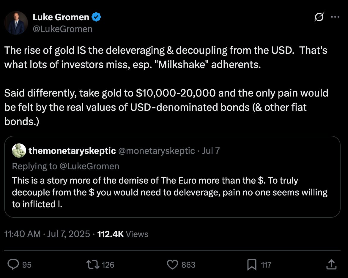 Luke Gromen, a macro thinker who’s been ahead of the curve on this issue, has long argued that monetizing gold is a viable, if extreme, policy option.