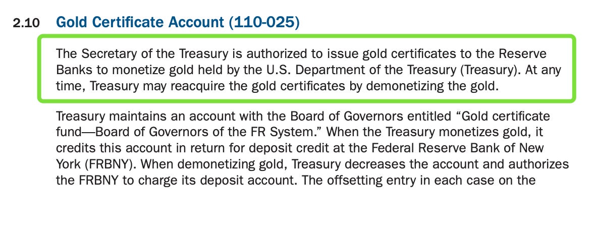 Tucked inside Section 2-10 is a revelation: the Treasury is authorized to issue gold certificates to the Federal Reserve.