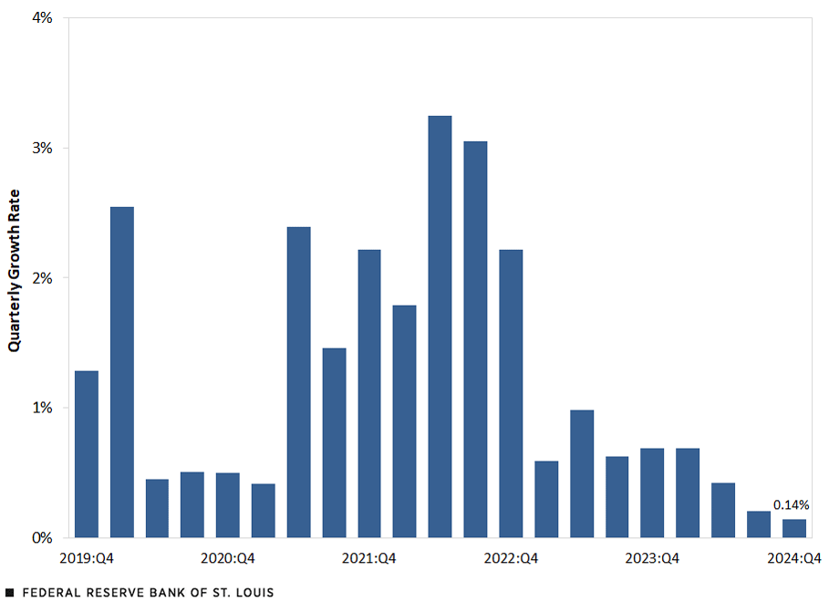 Commercial real estate lending growth dropped to an 11-year low, increasing just 0.14% quarter-over-quarter. (St. Louis Fed).