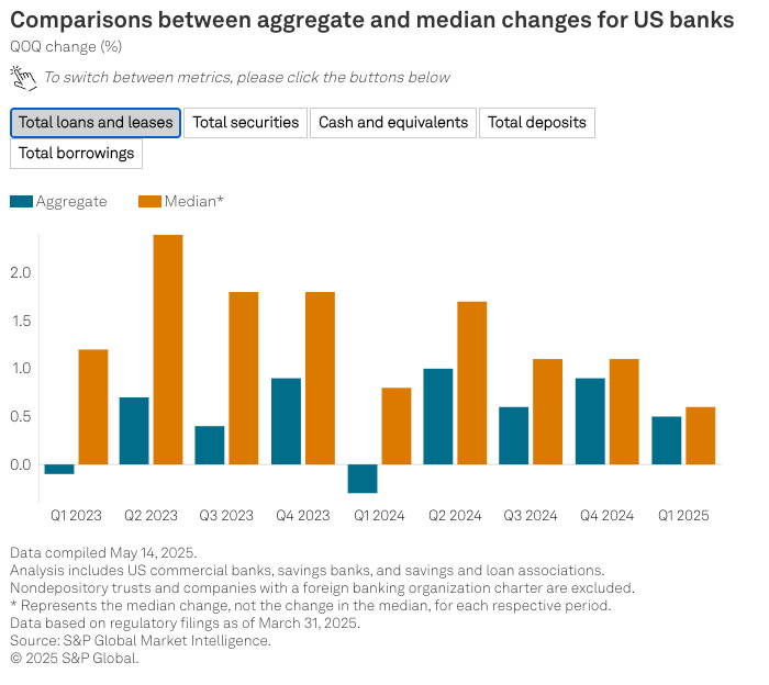 U.S. bank loan growth slowed to just 0.5% in Q1 2025, the weakest in over a year. (S&P Global Market Intelligence).