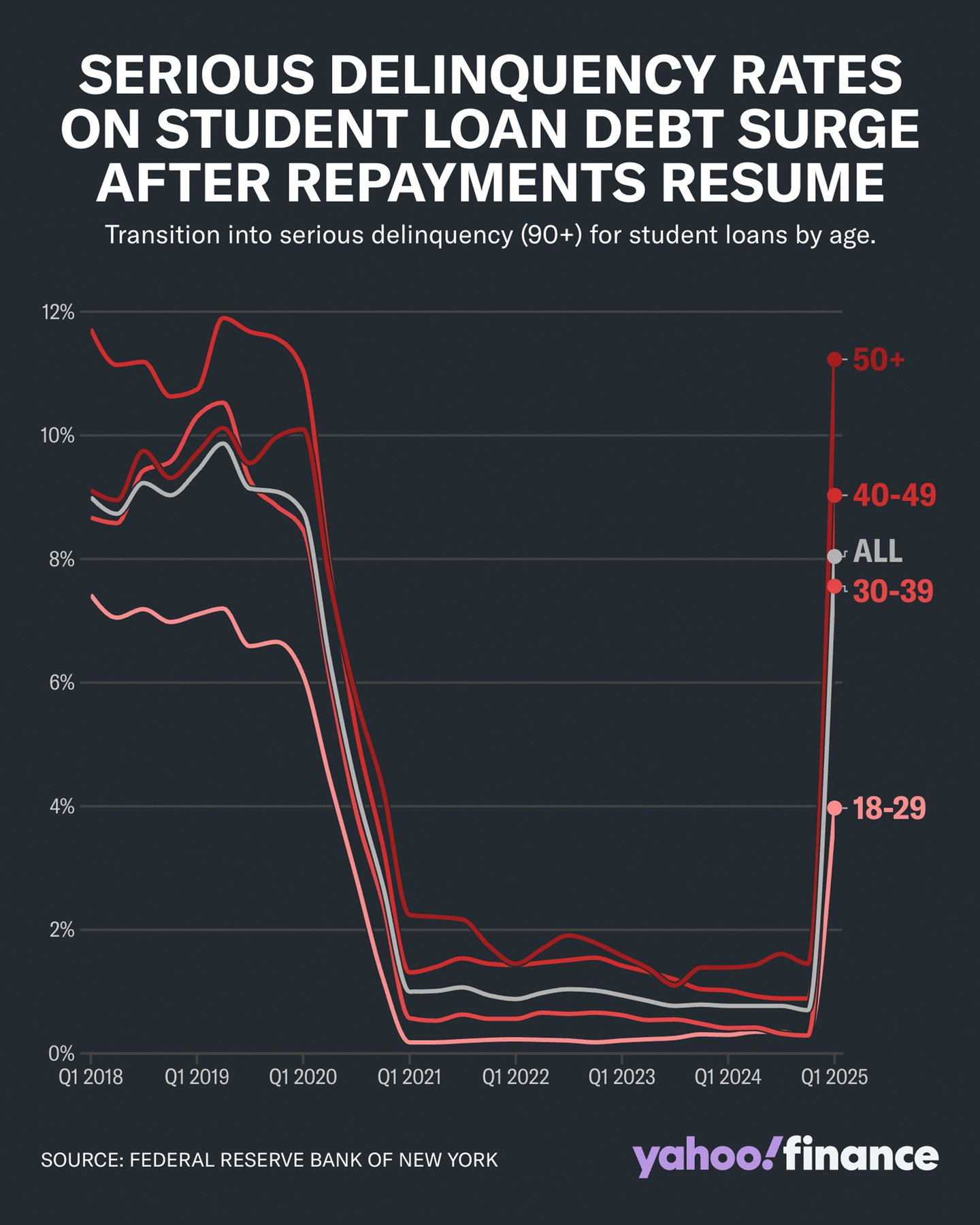 Student loan delinquencies surged to 8% in Q1 2025, the highest since the pandemic pause ended. (Barron's).