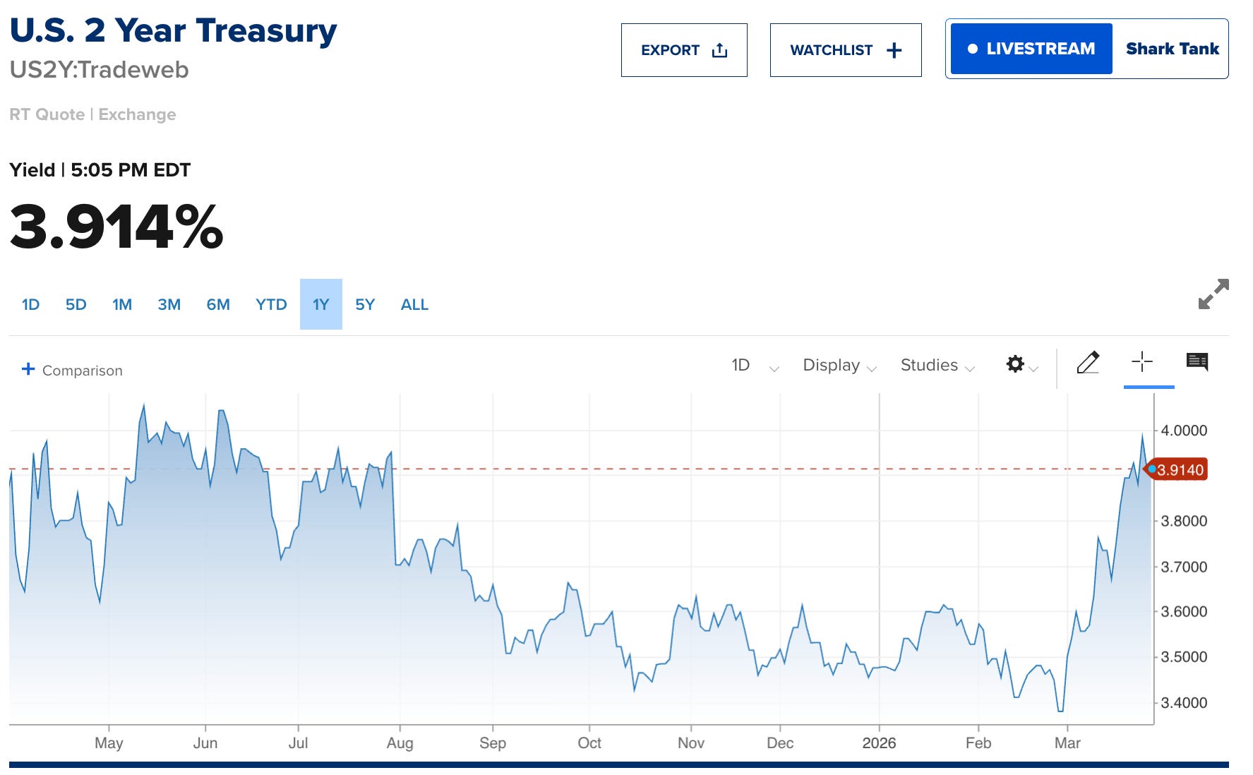 On Friday, March 27, something happened in markets that almost nobody in mainstream financial media connected the dots on. WTI crude oil surged to $99.64 per barrel, up $5.16 or 5.46% for the session, pushing briefly past the psychologically important $100 handle. Brent closed at $114.10. Gold was up. And the 2-year Treasury yield...fell.