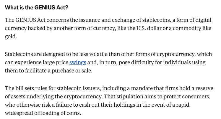 Some are pointing to the Genesis Act…a proposed piece of stablecoin legislation…as the cause. That’s noise. The act isn’t a central bank digital currency trojan horse.