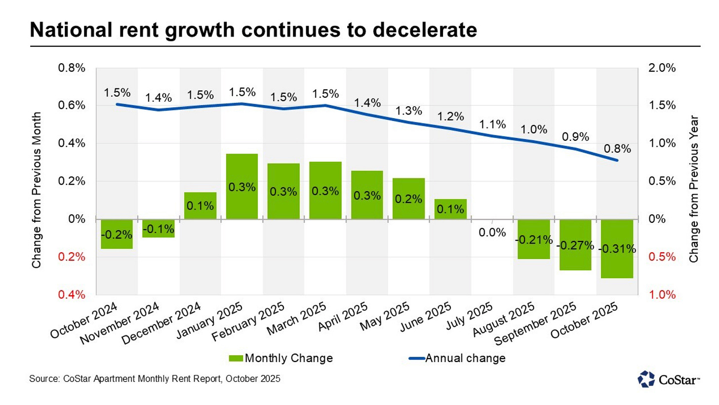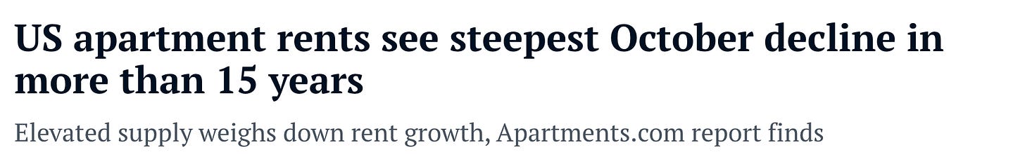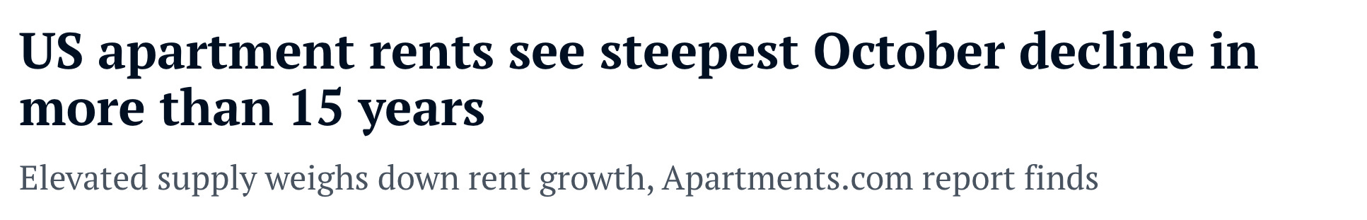 According to Apartments.com, October 2025 saw the largest monthly drop in U.S. apartment rents in over 15 years. We’re not talking about a slowdown in rent growth, or disinflation. We’re talking about outright deflation.