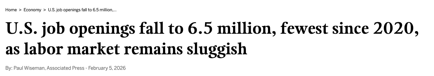 Third, and most important, JOLTS job openings collapsed to 6.5 million, missing expectations by a wide margin and falling roughly 400,000 from the prior print.