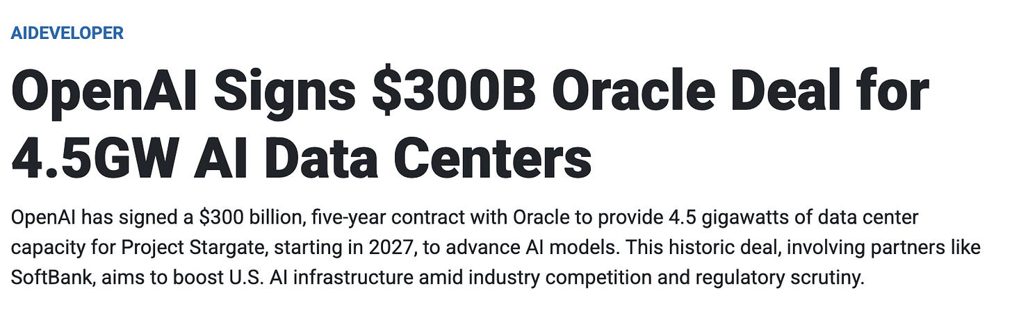 Oracle, another major player, just signed a $300 billion compute deal with OpenAI and is co-investing in Trump’s “Stargate” AI initiative.