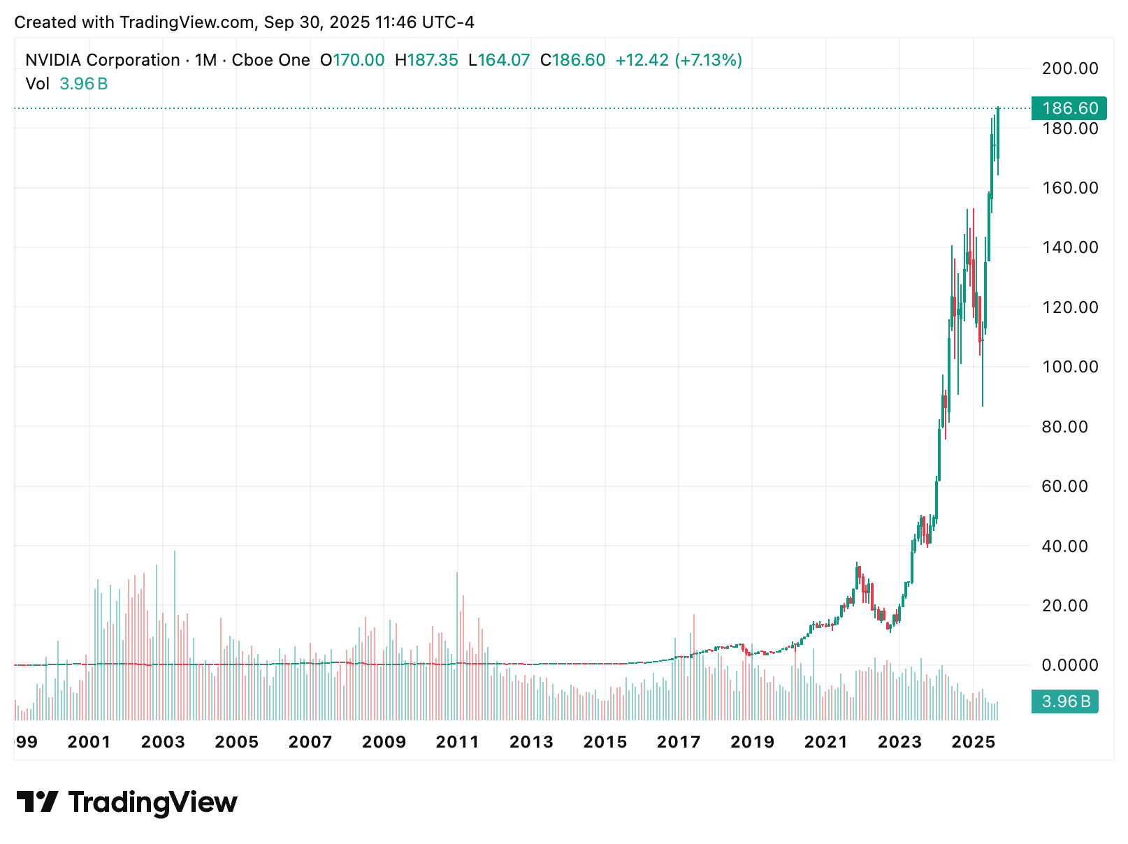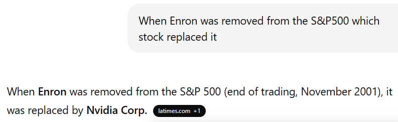 It’s more than symbolic: when Enron collapsed in 2001, Nvidia was the company that replaced it in the S&P 500.
