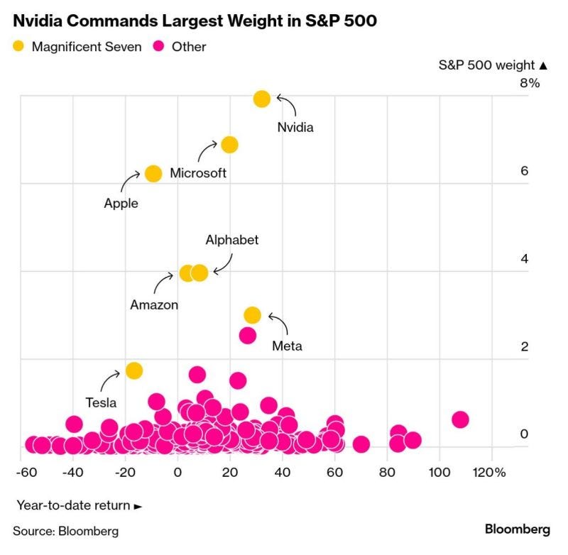 This is why the average investor thinks, “I don’t own Nvidia, I just own the S&P 500,” not realizing Nvidia is 8% of the entire index.
