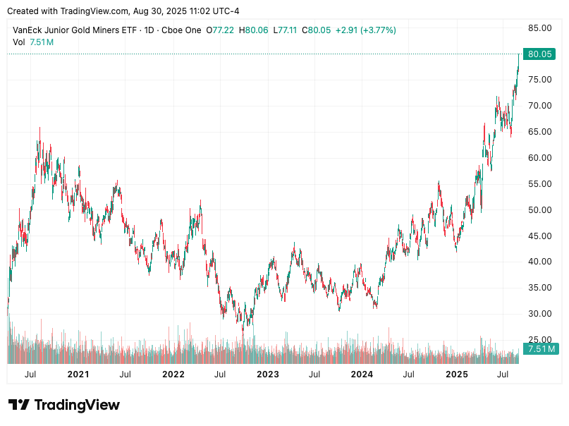 The GDXJ ETF, which bundles many of these wildcards together, has drawn a chart pattern straight out of a textbook: break resistance, retest as support, then blast skyward in a near-vertical climb.