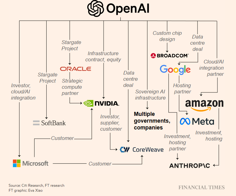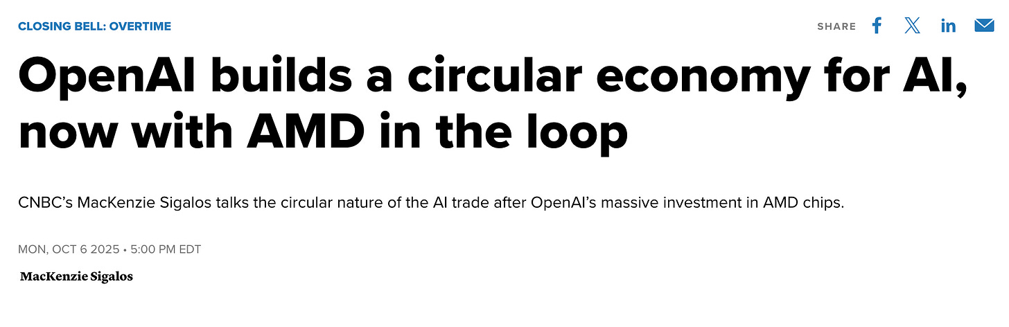 If OpenAI spends $1 billion with Oracle, who buys chips from Nvidia, who invests in Coreweave, who signs a contract with OpenAI…no new value is created unless external cash enters the loop. It’s just a hot potato.